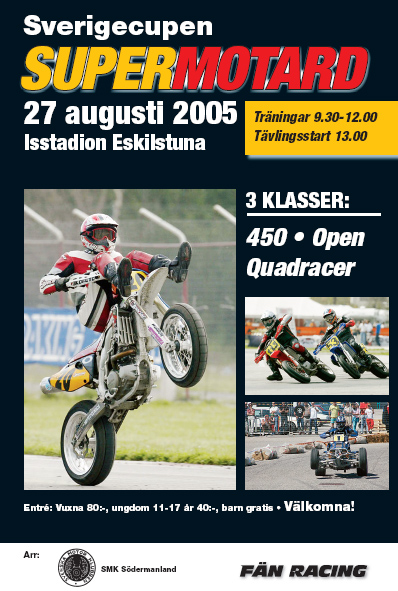 Anmälan och information om tävlingen hittar ni under fliken Quadracing, tävlingar Supermotard, Eller Ring Nippe 016-93125, 076-2471052